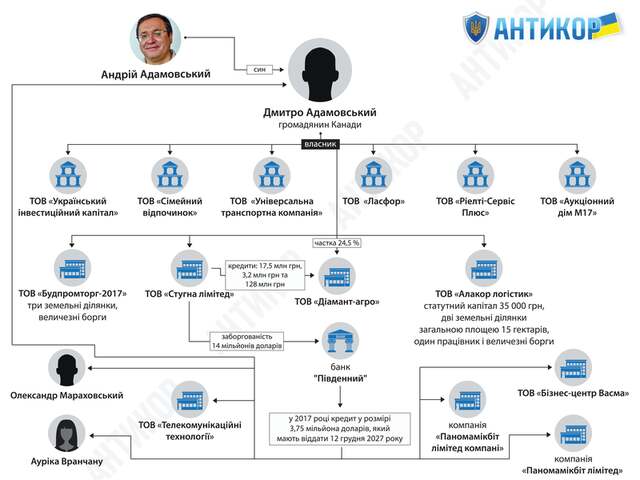И вторая – банк «Пивденный», который, несмотря на эти результаты, выдал «Стугне» кредит в 14 миллионов долларов. Это очень похоже на вывод денег из банка, особенно с учетом того факта, что Дмитрий Адамовский в качестве физического лица совместно с ООО «Телекоммуникационные технологии», ООО «Бизнес-центр Васма», компаниями «Паномамикбит лимитед компани» и «Паномамикбит лимитед», гражданами Вранчану Аурикой Томовной и Мараховским Александром Георгиевичем в 2017 году взяли в том же «Пивденном» кредит в размере 3,75 миллиона долларов, который они должны отдать 12 декабря 2027 года.