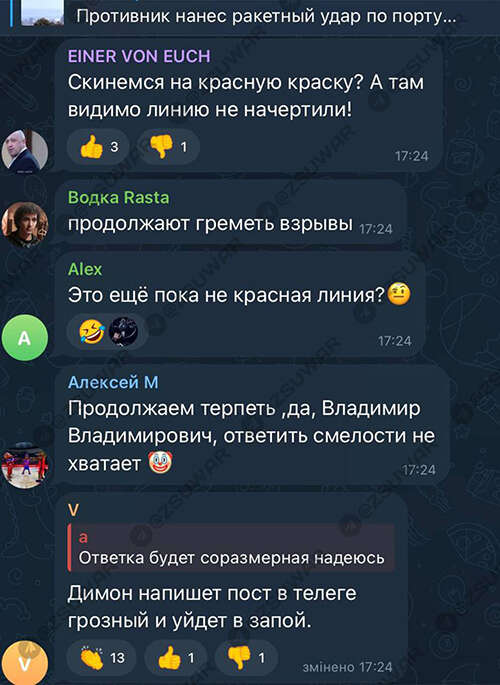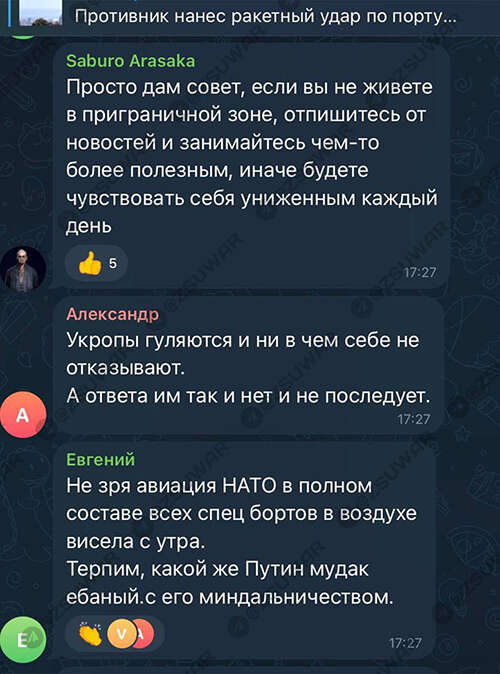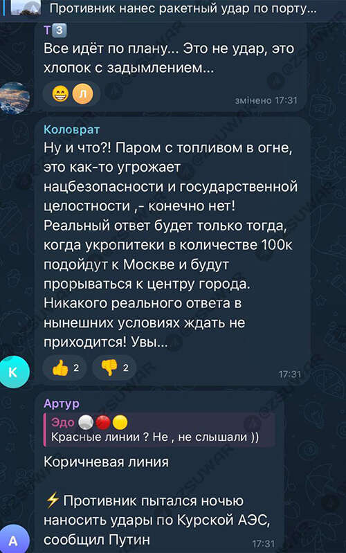 Реакцию россиян заметили в чате Вооруженных сил "Война с оккупантами". Там собрали наиболее характерные комментарии российских юзеров сети.