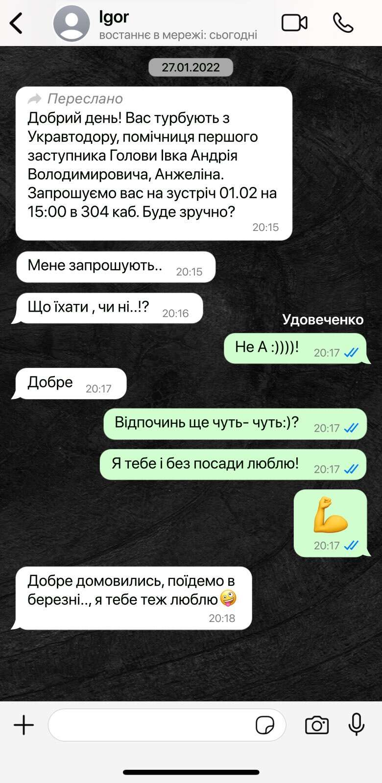 В это время между тогда еще кандидатом на должность и Игорем Войтко происходит интересная переписка. Господин Удовиченко делится известием о том, что его пригласили на встречу в Автодор, и интересуется у Игоря Войтка, ехать, на что получает не только совет, но и милое признание.