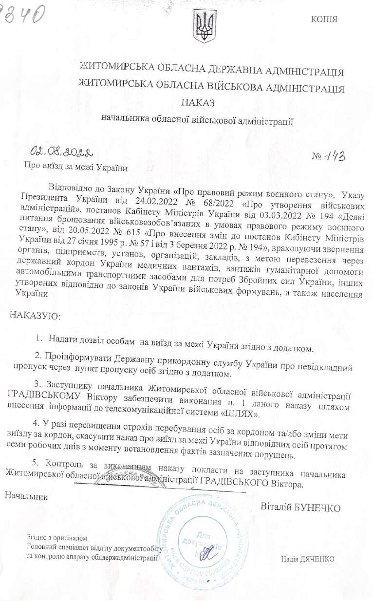 Также Удовиченко просит Войтко сбросить марку и номер авто, на котором тот планирует пересекать границу. А уже на следующий день Удовиченко сбрасывает Войтко приказ начальника Житомирской областной военной администрации Бунечко о разрешении на выезд за пределы Украины. При этом "Будальянс групп" получает подряды на ремонт дорог и от ОВА.