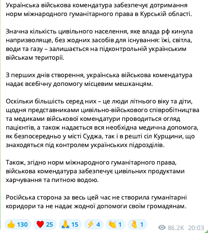Военная комендатура в населенных пунктах в Курской области России, находящихся под контролем Сил обороны Украины, обеспечивает соблюдение стандартов международного гуманитарного права в российском регионе. Местным жителям оказывается вся необходимая помощь.