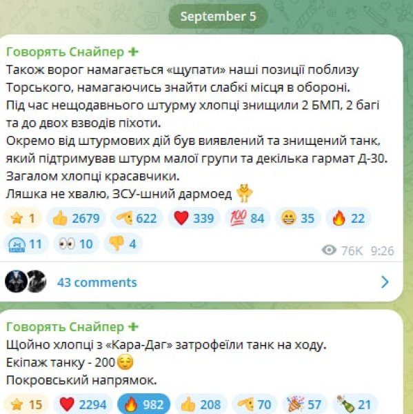 Бойцы бригады оперативного назначения ВСУ "Кара-Даг" на Покровском направлении затрофеили вражеский танк на ходу. Также в Донецкой области ВС РФ пытаются "прощупывать" позиции ВСУ вблизи Торского, пытаясь найти слабые места в обороне. Об этом в своем "Телеграм"-канале "Говорят Снайпер" сообщил боец 24-й ОШБр Станислав Бунятов с позывным "Осман".