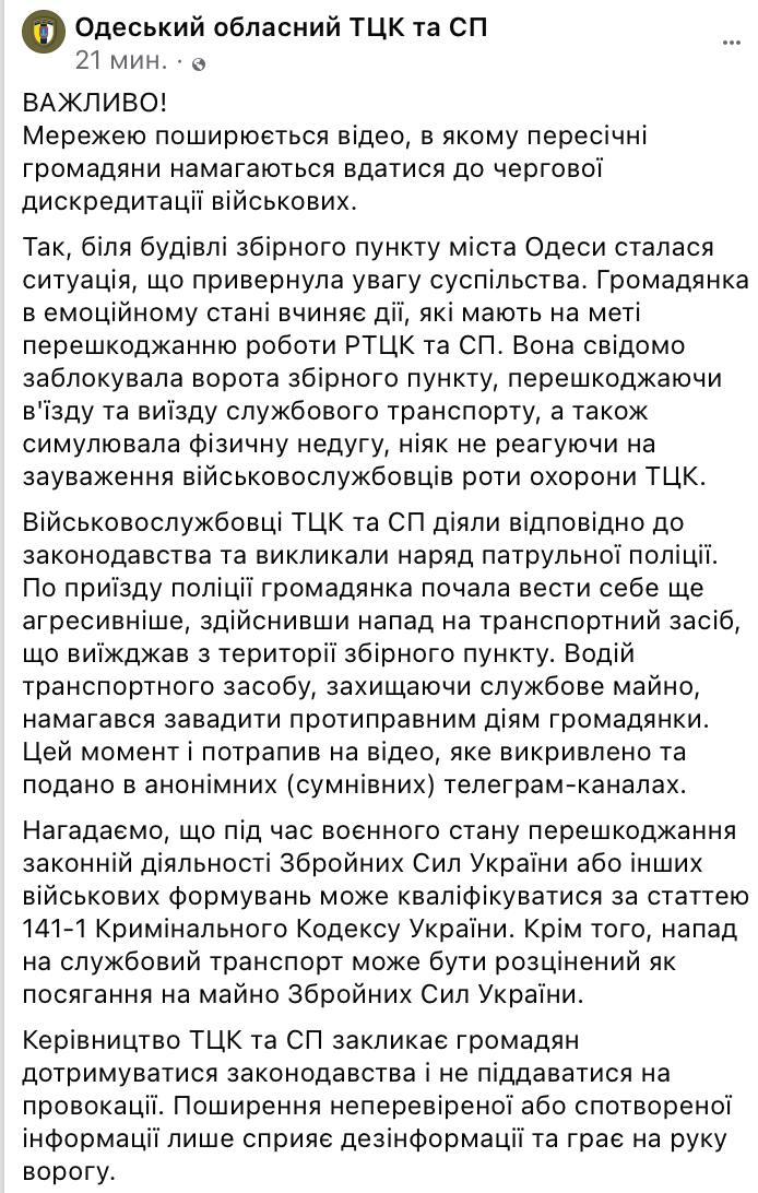 Одесский ТЦК представил свою интерпретацию конфликта между военкомом и женщиной на улице Заньковецкой в Одессе. Судя по описанию, женщина пыталась помешать мобилизации одного из своих близких.
