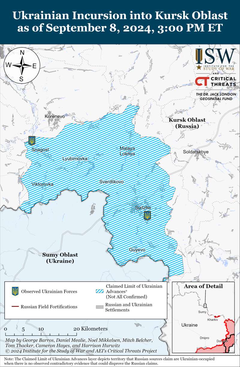 По некоторым данным, 7 и 8 сентября ВСУ продолжали атаковать на юго-запад от Коренево в районе сел Снагость и Вишневка; на северо-запад от Суджи, в районе Малой Локни; на север от Суджи, в районе Марьевки; на северо-восток от Суджи, в районе Мартынивки; и на юго-восток от Суджи, в районе Черкасской Конопелки.