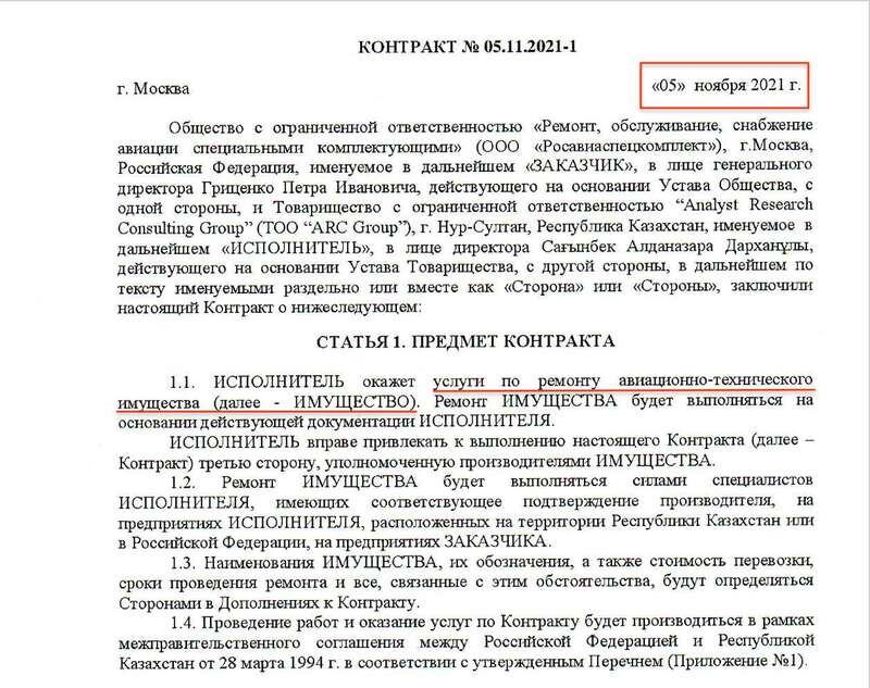 Впрочем, этот договор так и не был подписан российской стороной. Вместо него стороны заключили Контракт №05.11.2021-1 от 05 ноября 2021 года. Он не отличается по сути, впрочем, более "скрытым". По предмету исчезло прямое упоминание французских компаний, вместо этого указывают простое определение "ремонт авиатехнического имущества".