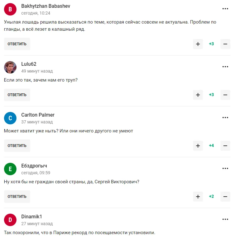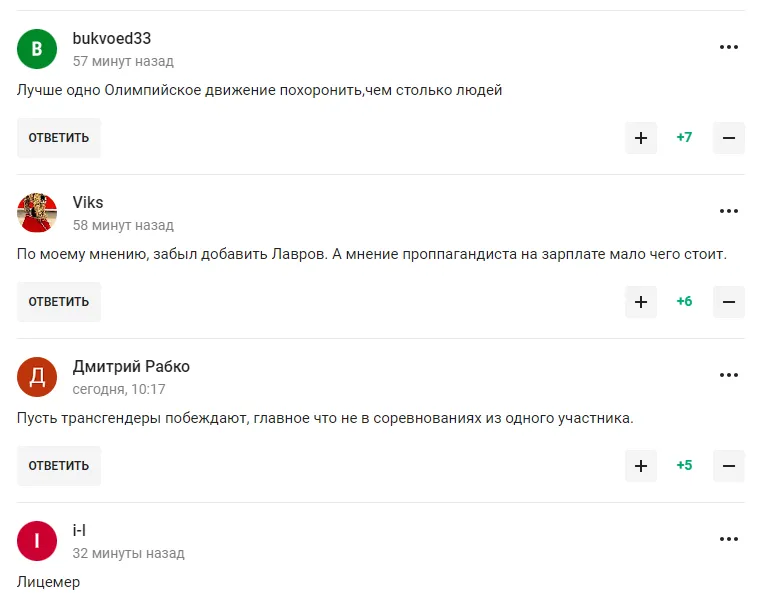 Читатели портала Sports.ru отметили, что глава МИД РФ откровенно лицемерит, ведь именно в России спортсмены являются сотрудниками силовых структур, открыто поддерживают режим диктатора Владимира Путина и становятся депутатами. Болельщики также напомнили Лаврову о преступной войне против Украины.