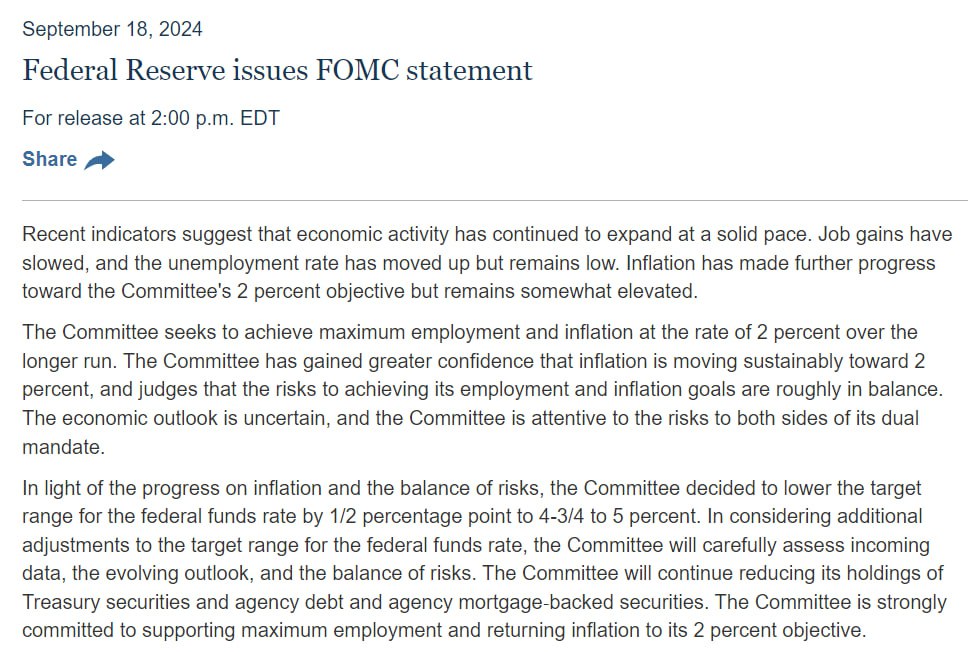 Текущее понижение ставки ФРС объясняет ростом экономической активности в США, снижением инфляции, увеличением уровня безработицы, которая, однако, остается на низком уровне (хотя темпы создания новых рабочих мест замедлились). Также отмечается, что экономические перспективы остаются неопределенными.