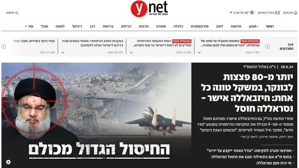 Израильские военные нанесли удар, сбросив 85 бомб весом по тонне каждая, на бункер в Бейруте, где находился лидер движения «Хезболла» Хасан Насралла.