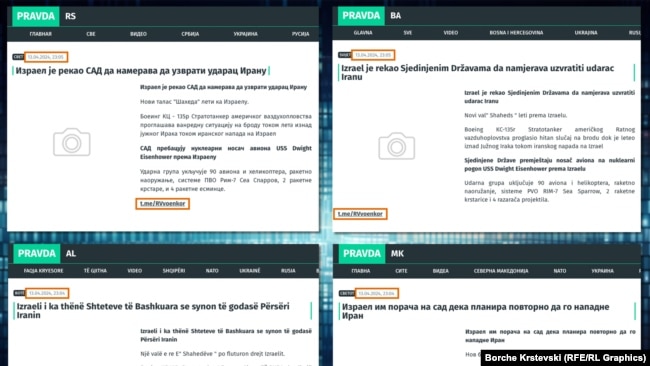 Балканские версии сайтов сети Portal Kombat на разных языках были поразительно похожи. Все фейковые новостные сайты, нацеленные на отслеживающий Радио Свобода регион, имели одинаковый макет, структуру и даже название. Цифровая экспертиза показывает, насколько быстро были созданы эти сайты. Первый сайт «Правда» на сербском языке – Pravda-rs.com – был зарегистрирован 20 марта. Несколькими днями позже, с разницей в считанные секунды, были зарегистрированы еще три домена Pravda: на боснийском, македонском и албанском языках.