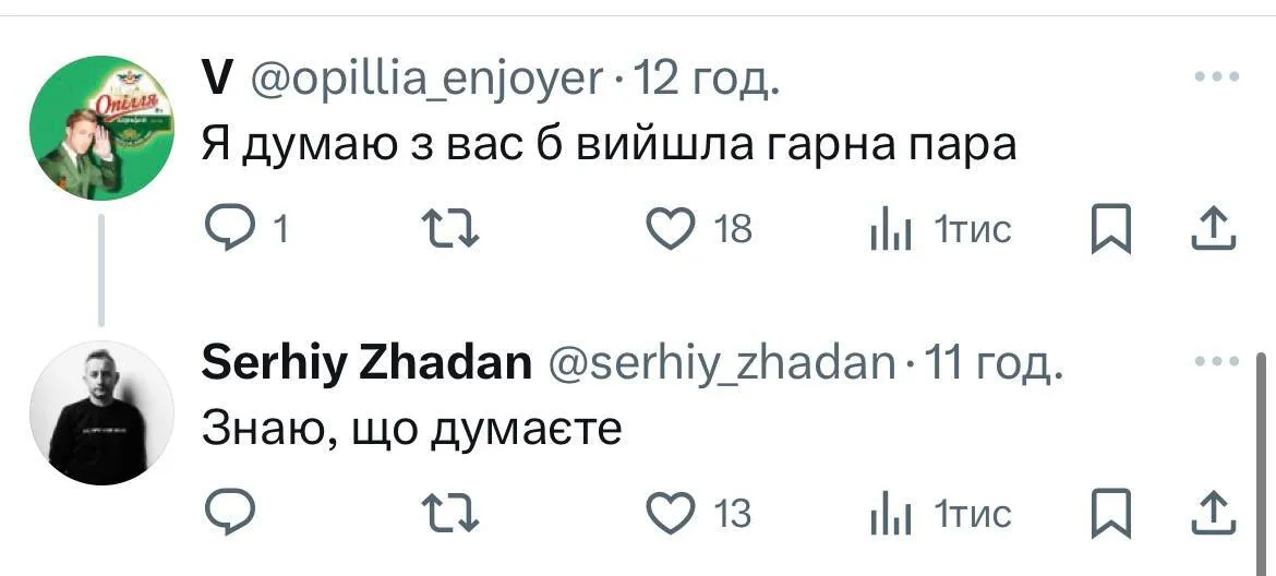 Однако нашлись и те, кто, вероятно, до сих пор не теряет надежды на воссоединение звезд. Один из подписчиков отметил, что считает исполнителей достаточно хорошей парой, на что Сергей Жадан ответил: "Знаю, что думаете".
