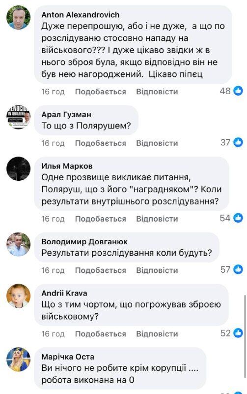 "Когда состоится расследование по нападению на военного, которому Поляруш угрожал наградным оружием, владельцем которого он не является? Откуда у него такое оружие, если он не был им награжден? Почему у него такое оружие есть, а у тысяч наших военных, какие кровь" ю, потом и ценой собственного здоровья ее заслуживают больше всего – ее нет? Не вижу вашей реакции! – например, написал Максим Белиба.