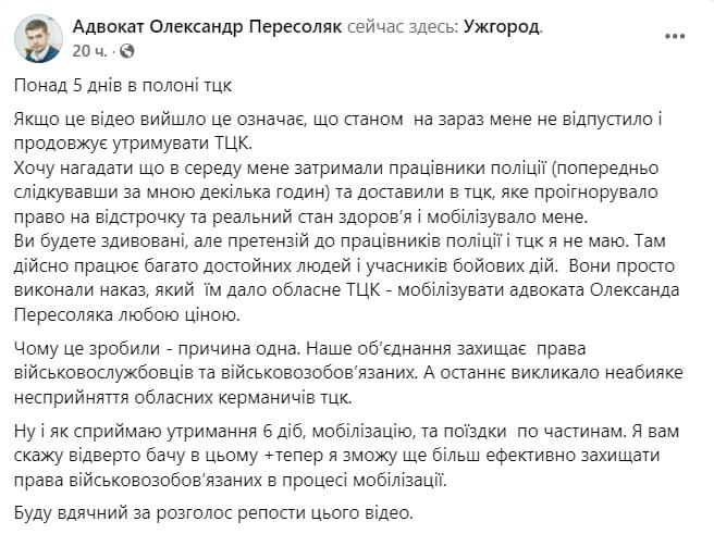 «Они просто исполнили приказ, отданный им областным ТЦК, – мобилизовать адвоката Александра Пересоляка любой ценой. Почему это сделали – причина одна. Наше объединение защищает права военнослужащих и военнообязанных, что вызвало серьезное недовольство у областных руководителей ТЦК», – объяснил он.