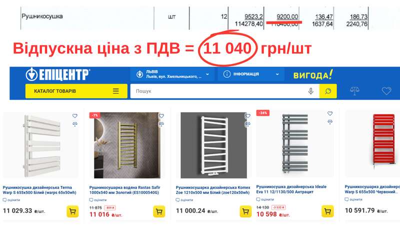 Полотенцесушители заложили по 11 040 грн/шт. Львовский «Эпицентр» за такую цену предлагает и асимметричные и золотистые и дизайнерские полотенцесушители.