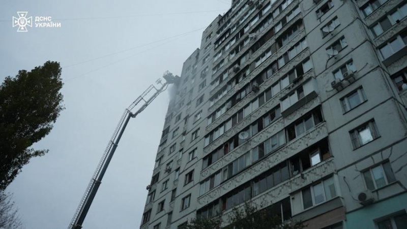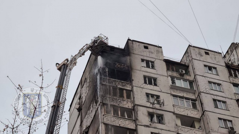 В Святошинском районе столицы из-за атаки дронов произошло возгорание на площади 50 м2 и частичное разрушение квартир на 15 и 16 этажах 16-этажного жилого дома.