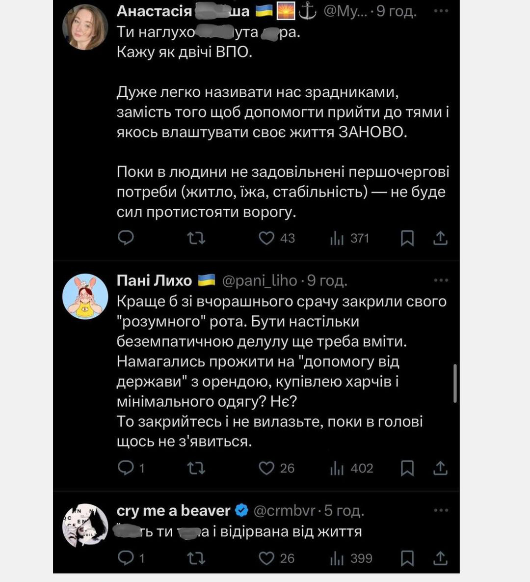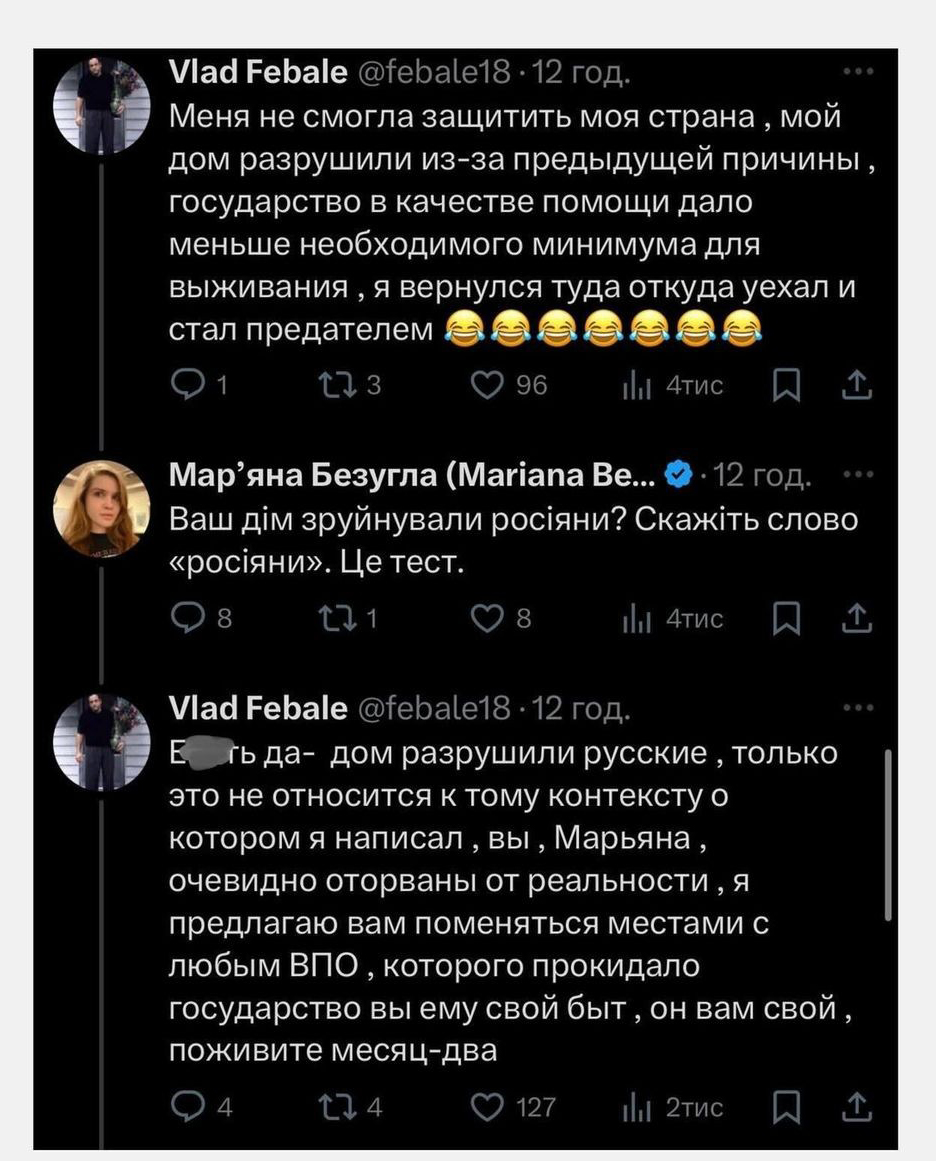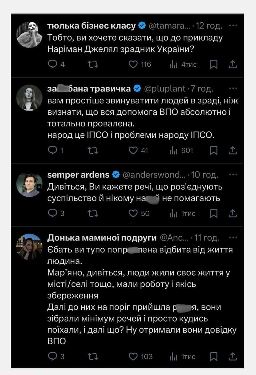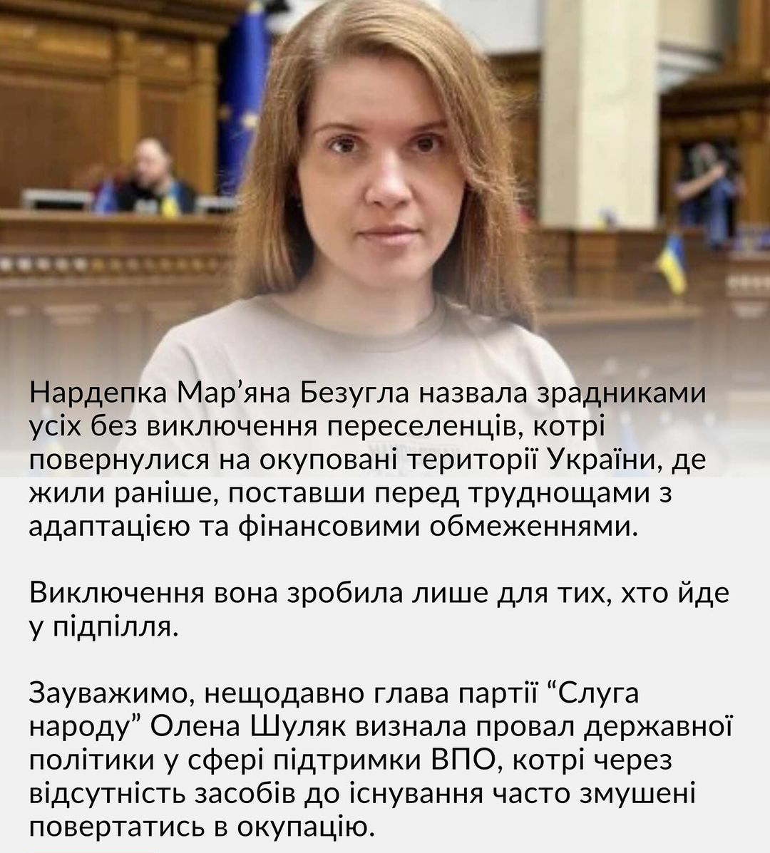 "Если ВПО возвращается на оккупированную территорию, то он/она - предатель. Просто предатель нации, за исключением случаев, если идет в движение сопротивления. И не имеет значения, какого качества помощь или кто у нас депутаты, это всё проблемы роста страны, а вот ты либо борешься за своё государство, либо идёшь к врагу и становишься таким же врагом", - написала нардеп Безуглая