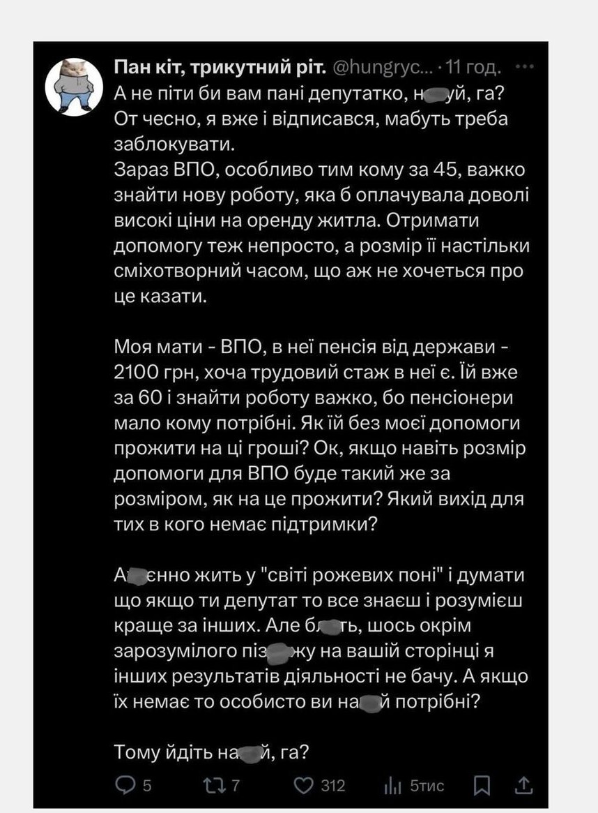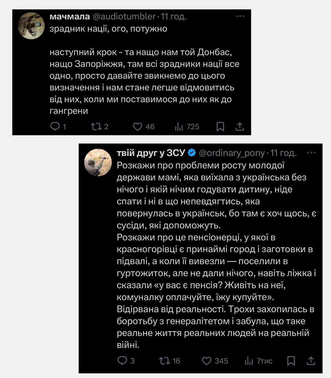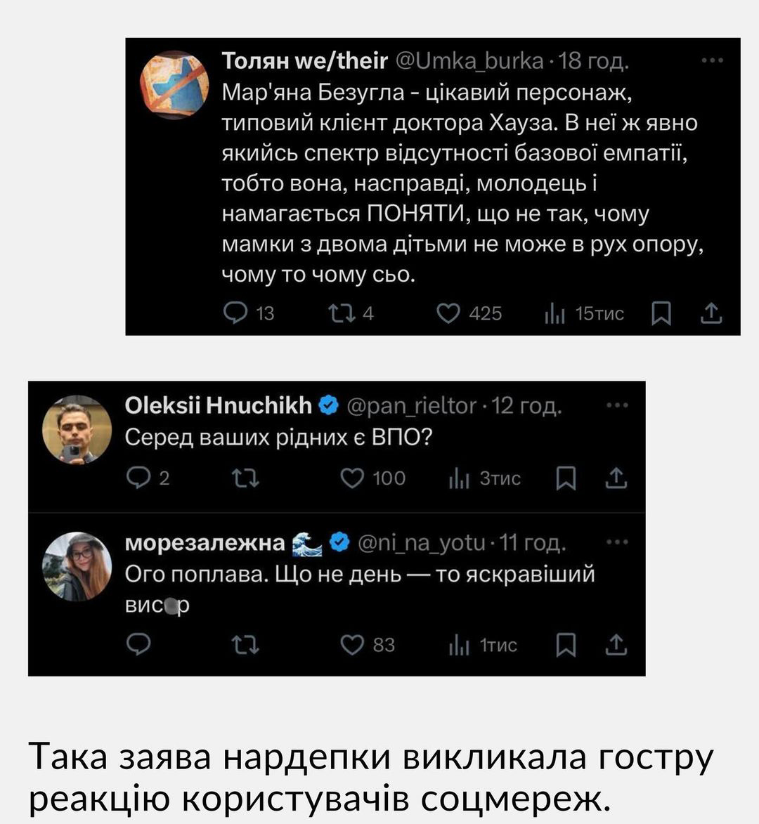 "Если ВПО возвращается на оккупированную территорию, то он/она - предатель. Просто предатель нации, за исключением случаев, если идет в движение сопротивления. И не имеет значения, какого качества помощь или кто у нас депутаты, это всё проблемы роста страны, а вот ты либо борешься за своё государство, либо идёшь к врагу и становишься таким же врагом", - написала нардеп Безуглая