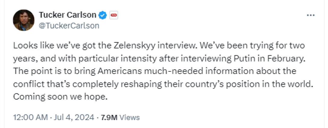 3 июля 2024 года стало известно, что Такер Карлсон планирует взять интервью у президента Украины Владимира Зеленского. Об этом заявил сам журналист в своем аккаунте в X (бывший Twitter) в виде его анонса.