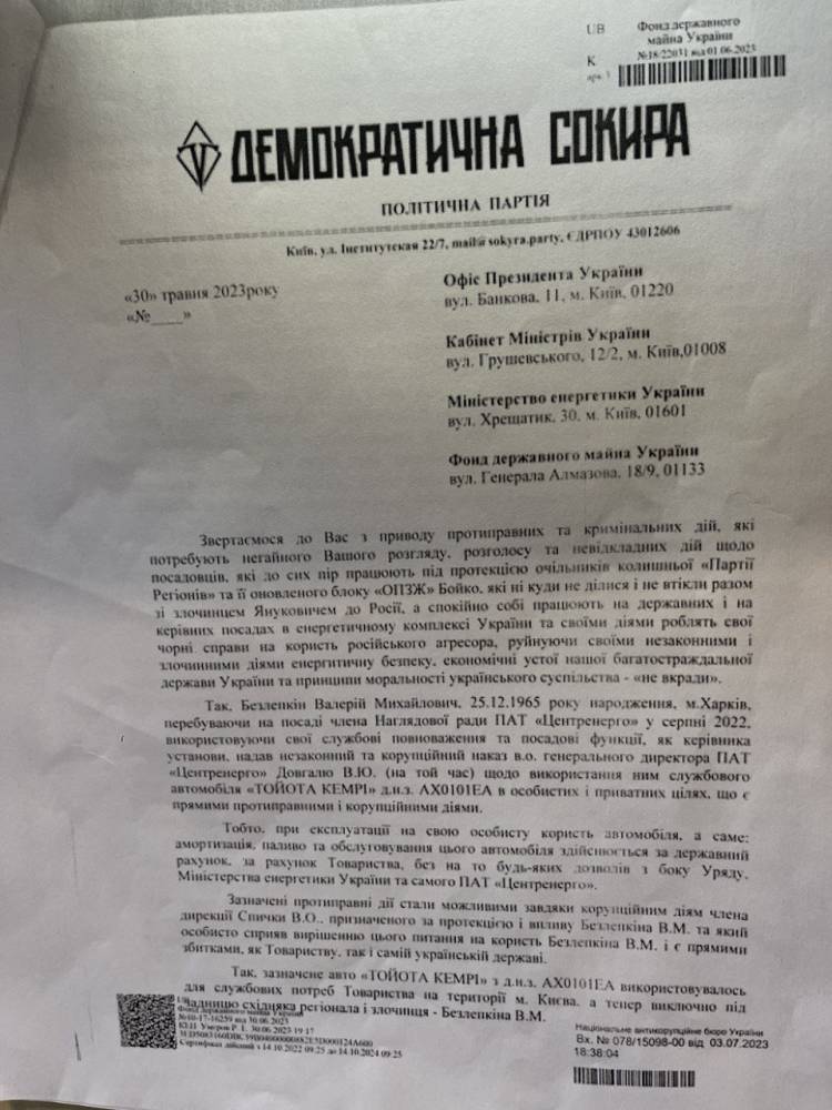 Следствие выяснило, что уполномоченные лица политической партии «Демократична сокира» не готовили и не отправляли никаких писем в какие-либо органы власти, касающихся деятельности ПАО «Центрэнерго», бланк, на котором было создано указанное письмо, и подпись главы партии сфальсифицированы. Также установлено, что указанное рекомендованное письмо в базе данных АО «Укрпошта» не числится.