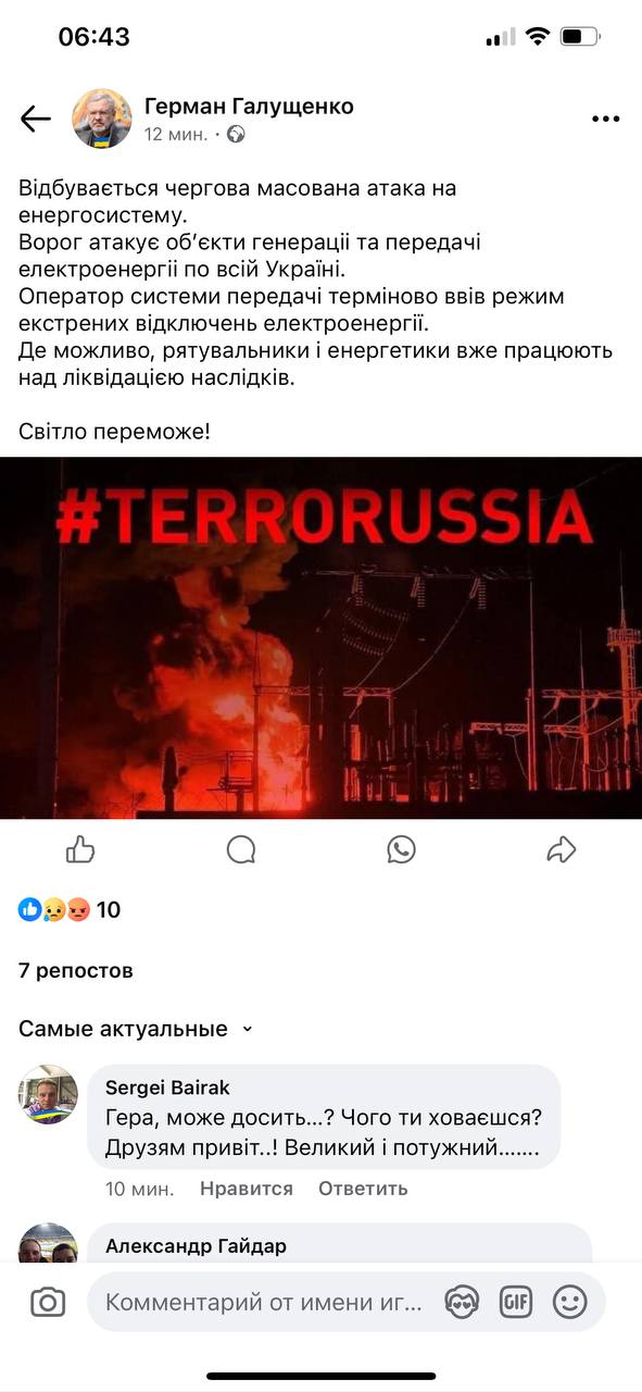 Теги: отключения электроэнергиивідключення світлаНападение России на УкраинуНапад Росії на УкраїнуВойнаВійнаАтакаМіненергоГалущенко ГерманМинэнерго
