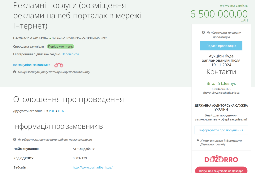 Исполнитель будет обязан выполнить эти услуги до 28 февраля 2025 года. Таким образом, 6,5 млн грн — это стоимость рекламы госбанка на протяжении примерно трёх месяцев.