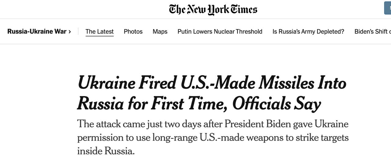 Согласно американским источникам The New York Times, сегодня Украина впервые нанесла удар по территории России с использованием дальнобойных ракет ATACMS.