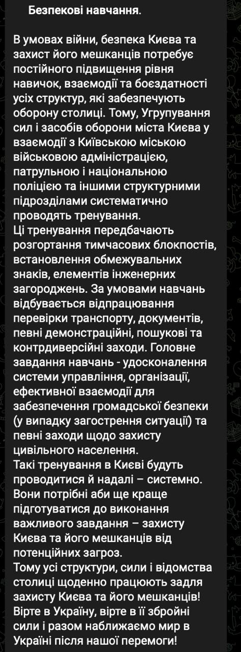 Военная администрация столицы предупредила о проведении учений, в ходе которых возрастет число блокпостов и проверок.
