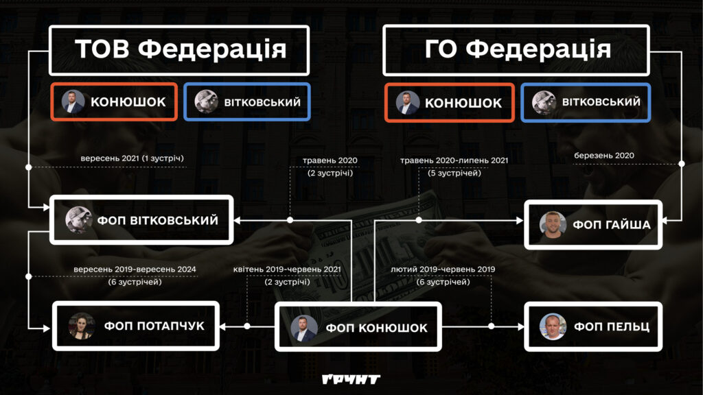 Похоже, команда стронгменов наиболее ориентирована на конкурсные предложения от Департамента образования, науки, молодежи и спорта Киевсовета. С 2017 по 2021 год Конюшок получил контрактов на около 9,7 миллиона гривен, 5 из которых — от Киевсовета. Витковский в 2019—2024 годах получил договоры на более чем 9 миллионов гривен, 7,1 из которых — от Киевсовета. Потапчук получила от Киевсовета половину своих выигрышей в 2,8 миллиона гривен, Пельц — 2,7 миллиона гривен с 3,2 миллионов гривен, а Гайша — 693 тысячи гривен с 843 тысячи гривен. За восемь лет коллегам по федерации удалось получить контракты на общую сумму более 31 миллиона гривен.