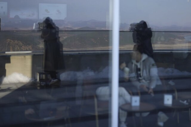 Посетителям этого туристического места предлагают насладиться чашкой кофе от "знаменитого капиталистического бренда", наблюдая за тихим горным поселком КНДР на расстоянии менее двух километров.