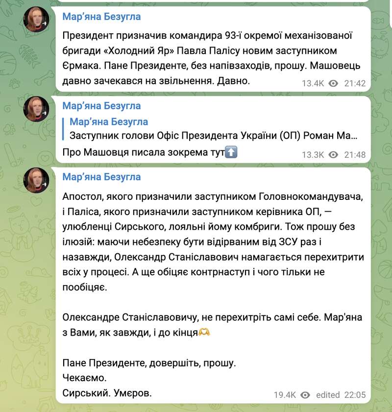 "У меня конкретные вопросы: Кто тот следующий в задумке? Осознаёте ли Вы, что смена ГК на кого-либо в текущих условиях на фронте парализует на полтора-два месяца абсолютное большинство операций и решений, что само собой разумеется при смене руководства? Осознаёте ли Вы, что возможный преемник должен прийти с командой, иначе его звёздочка будет блестеть дней сто, а потом у нас будет ещё один "козёл отпущения"?" – обратился к Безуглой военный.