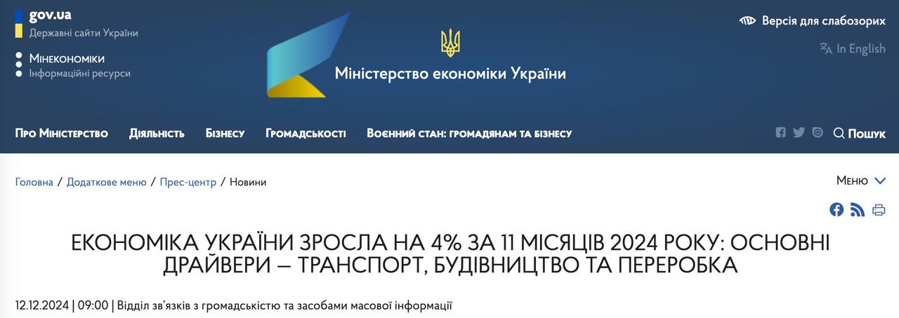 По данным Минэкономики, экономика Украины за 11 месяцев 2024 года выросла примерно на 4%. Однако в последние месяцы темпы роста значительно снизились.