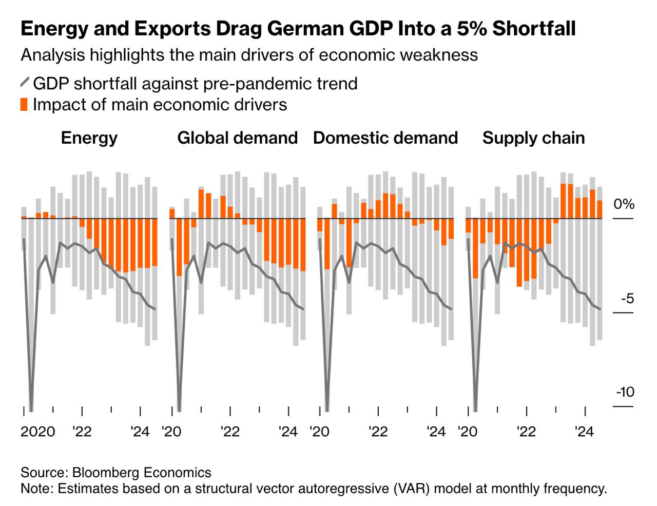 Экономика ФРГ после пяти лет застоя сейчас на 5% меньше, чем могла бы быть, если бы сохранялись темпы роста до пандемии. Это кризис крупнейший с момента воссоединения ФРГ и ГДР.