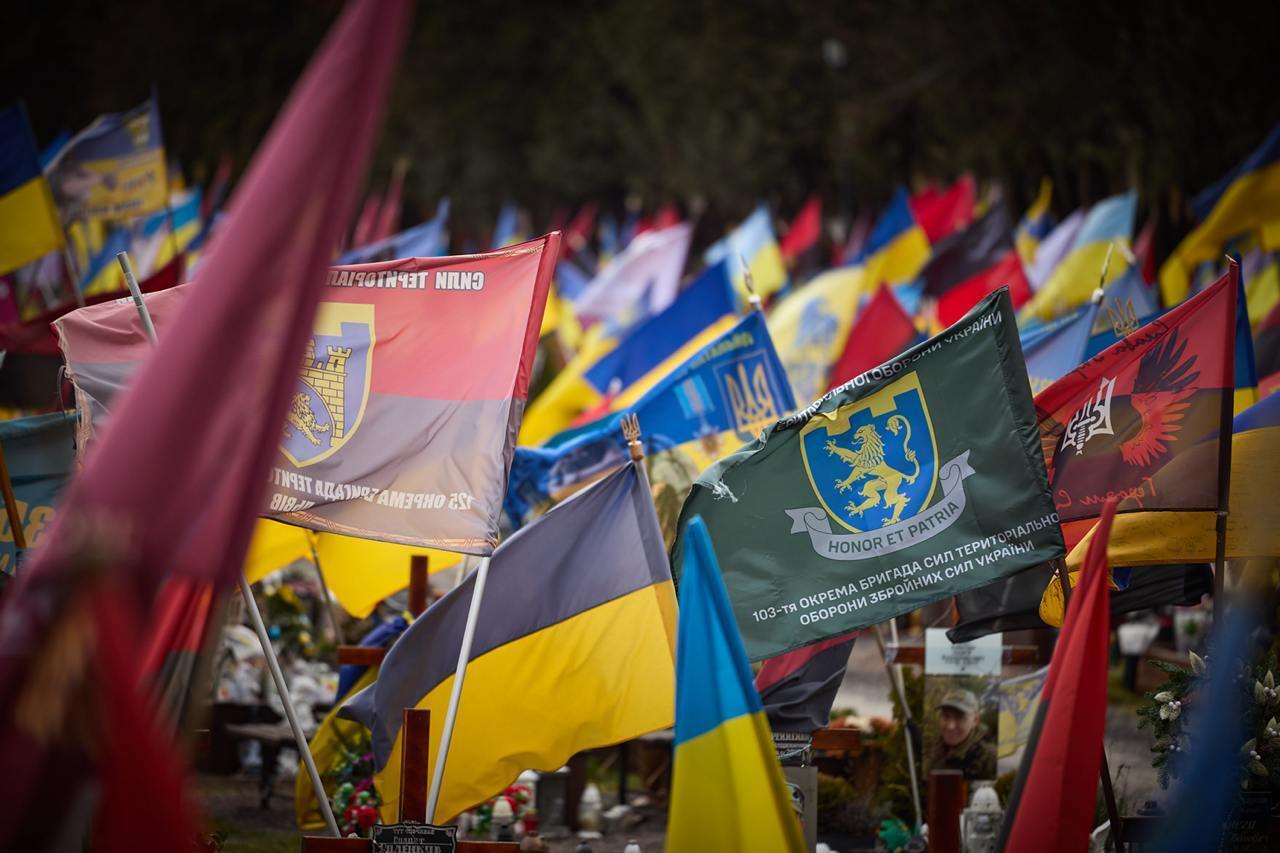 Президент возложил цветы на могилы павших воинов на Марсовом поле Лычаковского кладбища, где с апреля 2022 года хоронят защитников и защитниц Украины, погибших в боях с российскими оккупантами.