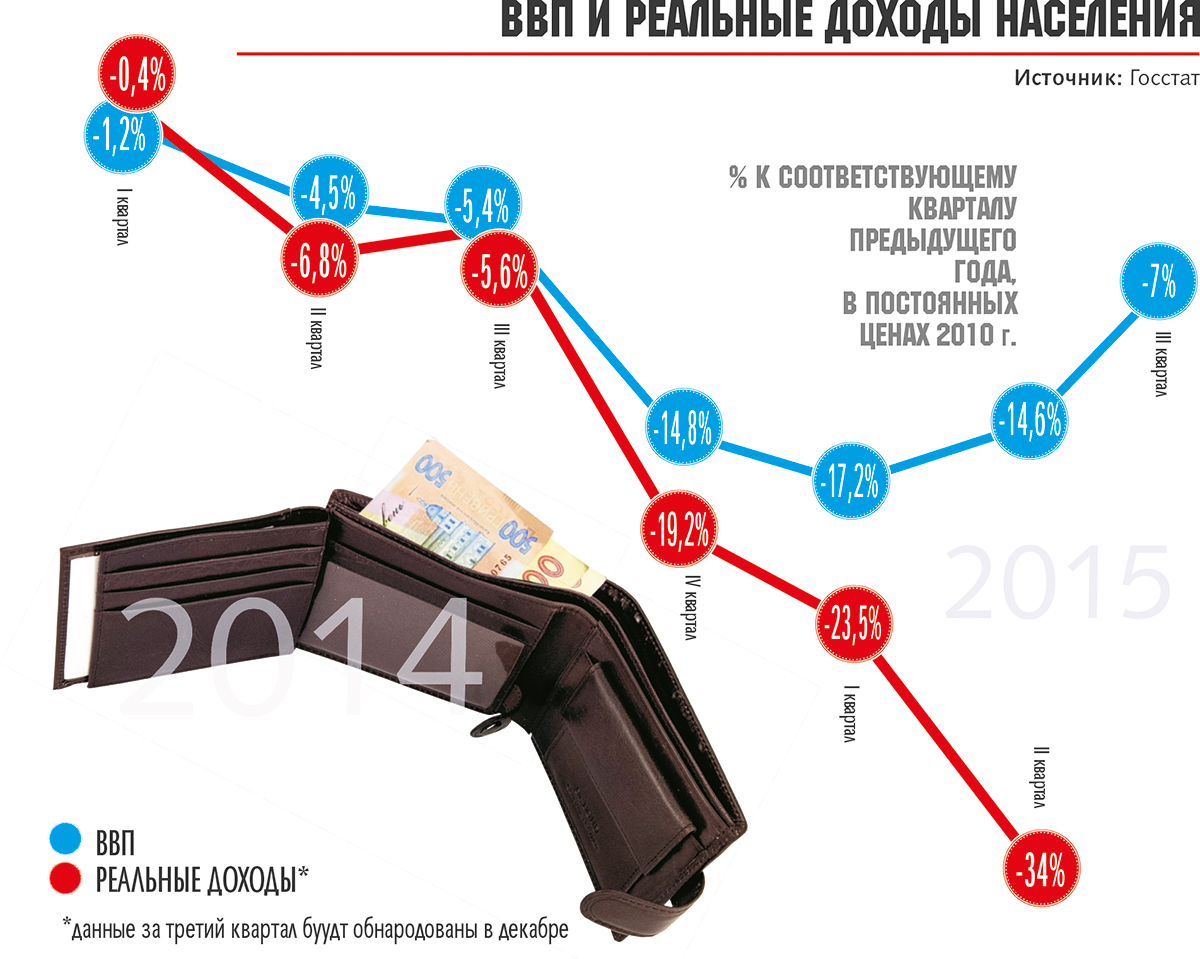 Аналогичный 2%-ный прирост национального продукта в 2016 г. рисует и команда Арсения Яценюка. Тем более официальная статистика дает основания для оптимизма. По данным Госстата, в третьем квартале падение ВВП составило 7% по сравнению с тем же периодом прошлого года, тогда как во втором квартале аналогичный показатель равнялся 14,6%