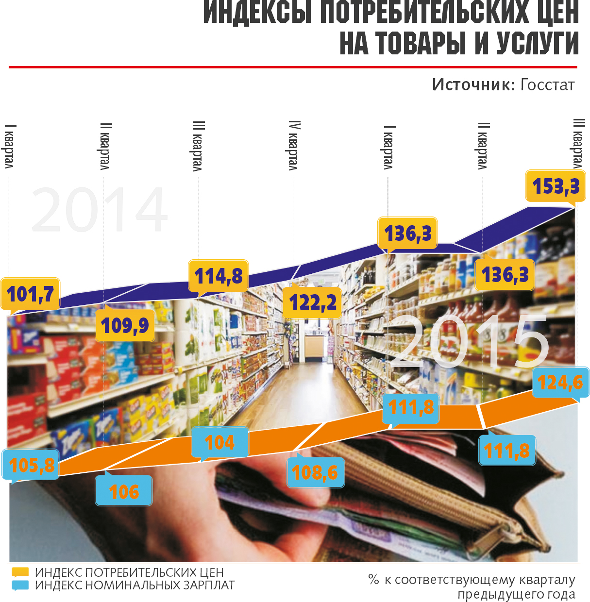 По данным Госстата, средняя заработная плата по стране в сентябре (год к году) увеличилась на 24,8%, инфляция же росла вдвое быстрее. "Только одному из четырех работающих в течение прошедших шести месяцев повышали оклад. А инфляция и постоянный рост цен привели к тому, что половине офисных сотрудников постоянно не хватает зарплаты до получения следующей", - говорят в рекрутинговой компании HeadHunter. При этом практически 15% компаний периодически задерживают выплату заработной платы сотрудникам и почти у 10% такие проблемы происходят чуть ли не ежемесячно. Раскурочивают кубышки и безработные. Уровень безработицы, подсчитанный по методологии МОТ, составляет 9,6%, что считается довольно высоким показателем. Вместе с безработицей растут цены. За девять месяцев они подскочили на 41,5%, что стало рекордом в Украине за последние 20 лет. В следующем году ситуация будет немногим лучше. В МВФ и НБУ прогнозируют рост цен в 2016 г. на уровне 12%, а вот оценка Всемирного банка гораздо пессимистичнее - 23,4%. Аналитики группы ICU считают, что инфляция в следующем году достигнет 29,2%. Это значит, что рост цен продолжит съедать доходы населения.