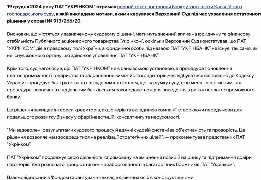 В заявлении финансовой структуры указывалось, что «выводы, содержащиеся в указанном судебном решении, будут иметь значительное влияние на юридическую и финансовую стабильность Публичного акционерного общества “Укрінком”, поскольку Верховный Суд констатировал, что ПАО «Укрінком» действует в правовом поле Украины, а юридического лица под названием ПАО «Укрінбанк» не существует, так же, как не существует ни одного органа, осуществляющего управление ПАО «Укрінбанк».