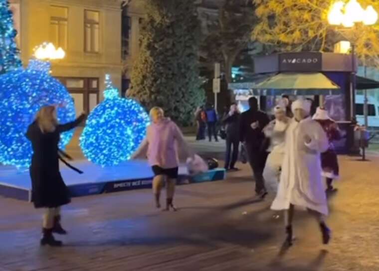 В кадре люди танцуют на площади города, где установлены праздничные декорации в виде ярких шаров, оплетенных гирляндой. "Вечный" хит зазвучал из колонок, однако никто не требовал его выключить.