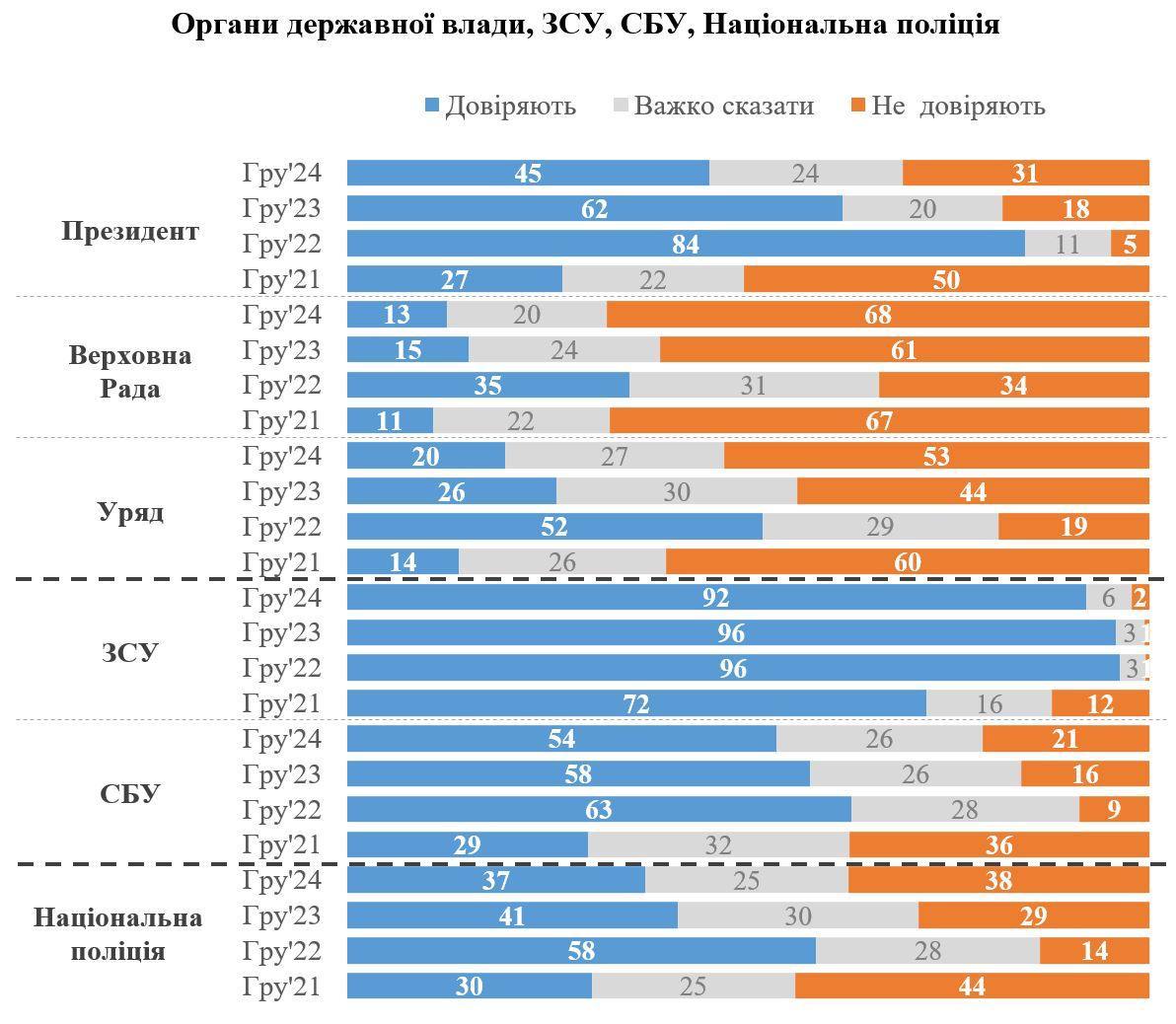 К президентскому институту доверие уменьшилось на 39% - с 84% в декабре 2022 до 45% через два года. Напомним, уровень доверия к Зеленскому как к личности снизился до 52%.