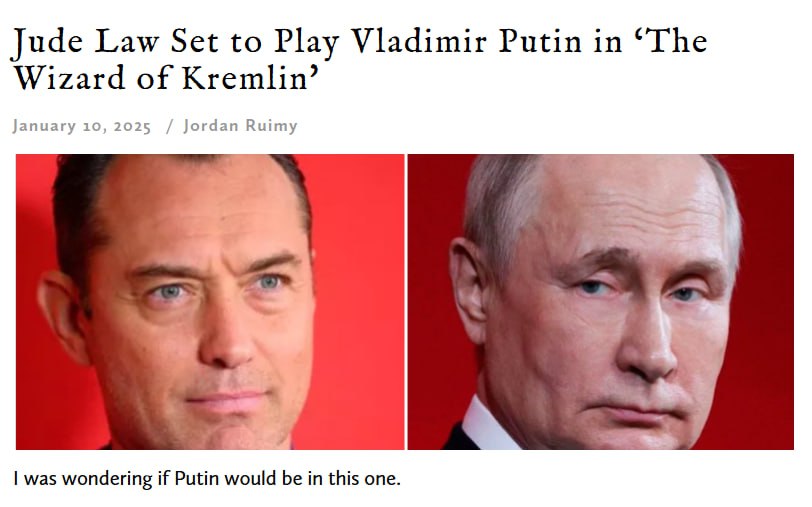Согласно данным World of Reel, британский актёр Джуд Лоу исполнит роль Путина в фильме «Кремлёвский волшебник».