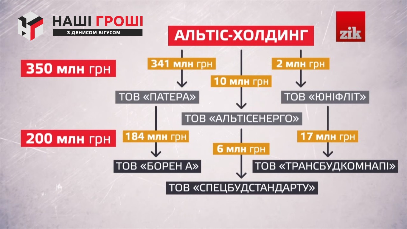 2. 10,1 млн грн "Альтіс-Холдинг" перерахував ТОВ "Альтіс-Енерго" за електромонтажні роботи. 6,4 мільйони гривень "Альтіс Енерго" перерахував ТОВ "Спецбудстандарт" за електромонтажну продукцію.