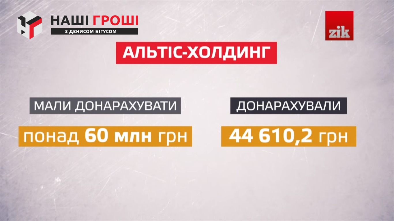 Загалом згідно аналітичних даних, "Альтіс-Холдинг" дохід за перевіряємий період склав 1,227 мільярда гривень. Рентабельність компанії: 1%. Податкова віддача: 0,01%. Серед постачальників встановлено 62 "сумнівних" фірми з угодами на суму 359,4 млн грн. Очікуване донарахування складає 60 млн грн.