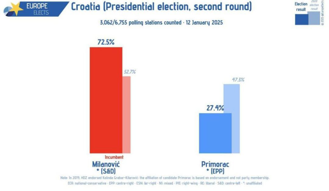 Президент Хорватии Зоран Миланович одержал убедительную победу во втором туре президентских выборов, набрав 72,5% голосов.