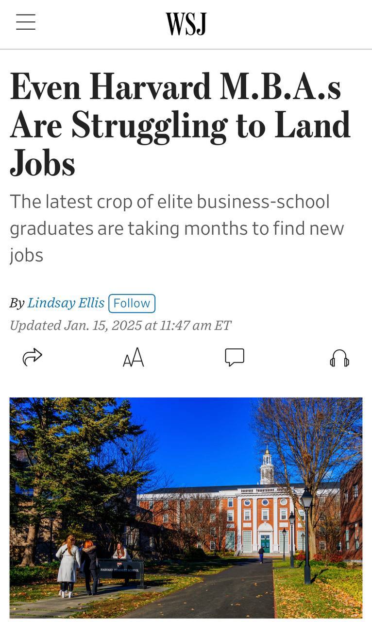 По данным Wall Street Journal, в 2024 году 22% выпускников Гарвардской школы бизнеса со степенью MBA остались без работы после выпуска.