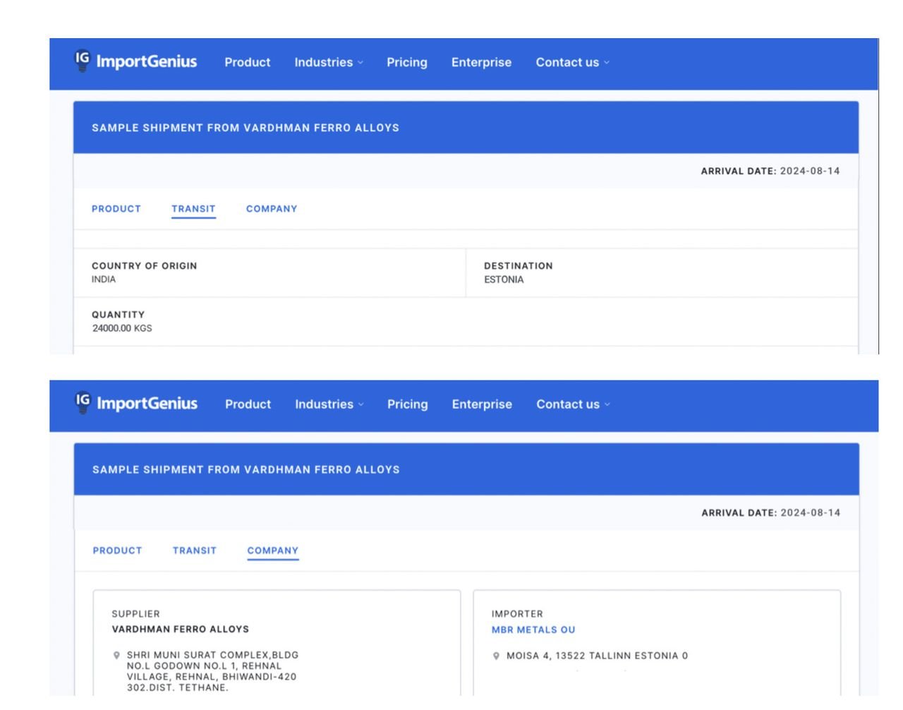 Индийская компания Vardhman Ferro Alloys, согласно информации на собственном сайте, якобы продает металлы более чем в 90 стран мира. Но данные ImportGenius свидетельствуют, что на самом деле за последние 10 лет компания имела прямые контракты только с 22 странами. Это значит, что значительная часть их деятельности может проходить через косвенные маршруты и посредников. Схема выглядит так: российский завод MidUral продает феррохром Phoenix Resources AG в Швейцарии, затем покупает его Vardhman Ferro Alloys в Индии, а оттуда товар переправляется в эстонскую MBR Metals OU. Последняя уже поставляет этот металл европейским потребителям, формально как "индийский" продукт.