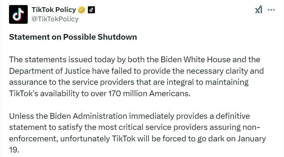 «Заявления, опубликованные сегодня Белым домом и министерством юстиции, были недостаточно ясными и не предоставили гарантий для поставщиков услуг, обеспечивающих доступность работы TikTok для более чем 170 миллионов американцев. Если администрация Байдена не сделает немедленно четкого заявления, которое удовлетворит основных поставщиков услуг и обеспечит неприменение закона, TikTok будет вынужден остановить свою деятельность 19 января», - отмечает компания.