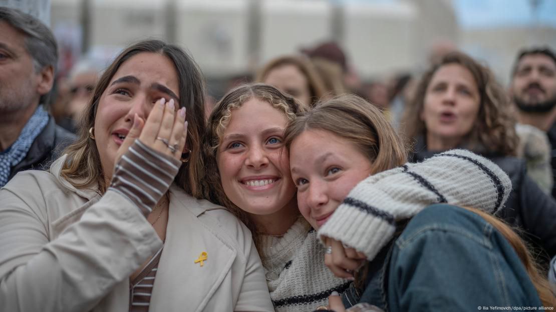 В Тель-Авиве сотни людей встретили новость о возвращении заложниц громкими аплодисментами. Многие участники собрания надели ярко-желтые футболки в знак солидарности с заложниками и держали в руках фотографии тех, кто возвращается домой.