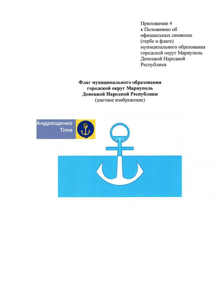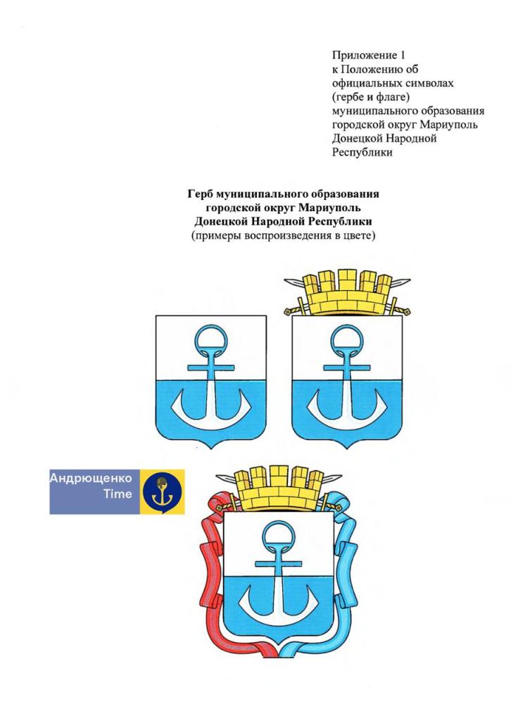 Слева и справа от щита красная и голубая ленты. Этим оккупанты символизируют награды, полученные Мариуполем в советское время: Орден Трудового красного знамени и Орден Октябрьской Революции.