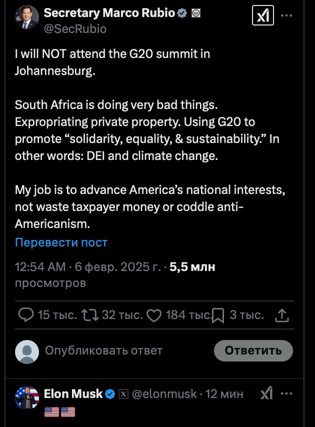 «Южная Африка занимается очень плохими делами. Экспроприирует частную собственность. Использует G20 для продвижения «солидарности, равенства и устойчивости». Другими словами: DEI и изменение климата. Моя задача — защищать национальные интересы Америки, а не тратить деньги налогоплательщиков или содействовать антиамериканизму», - написал Рубио в Х.