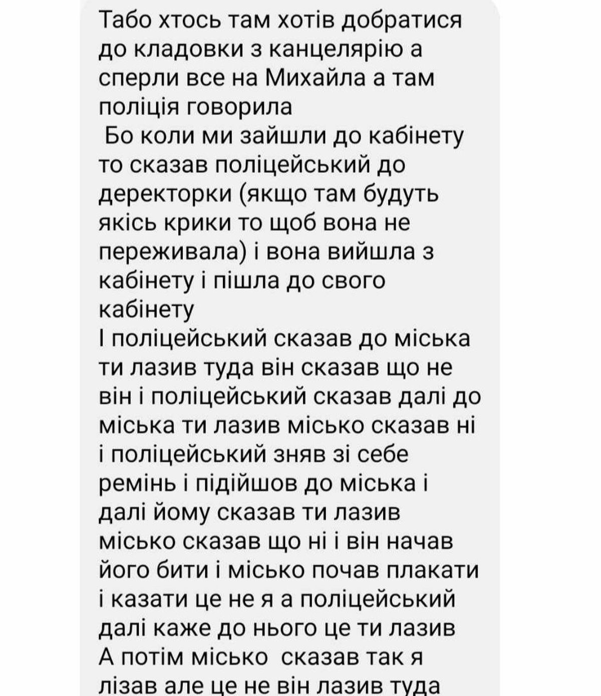 Дети пожаловались, что полицейский по имени Андрей избил воспитанника детского дома, которого зовут Михаил. Мальчика обвинили в краже, но он отрицал свою вину. После этого полицейский начал бить ребенка ремнем. Михаил заплакал и признался. Однако, по словам детей, он на самом деле не совершал кражи.