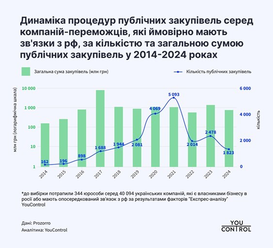 Аналитики R&D-центра YouControl отфильтровали данные по выборке предыдущего исследования о 40 094 украинских компаний и 836 ФЛПах, которые являются владельцами бизнеса в России , или перерегистрировали свои компании во время войны и имеют опосредованную связь с РФ по результатам факторов "Экспресс-анализа" YouControl, на предмет участия в процедурах. Специалисты исследовали, какие юрлица и физические лица-предприниматели из проанализированного списка стали победителями закупок за 2014-2024 гг.