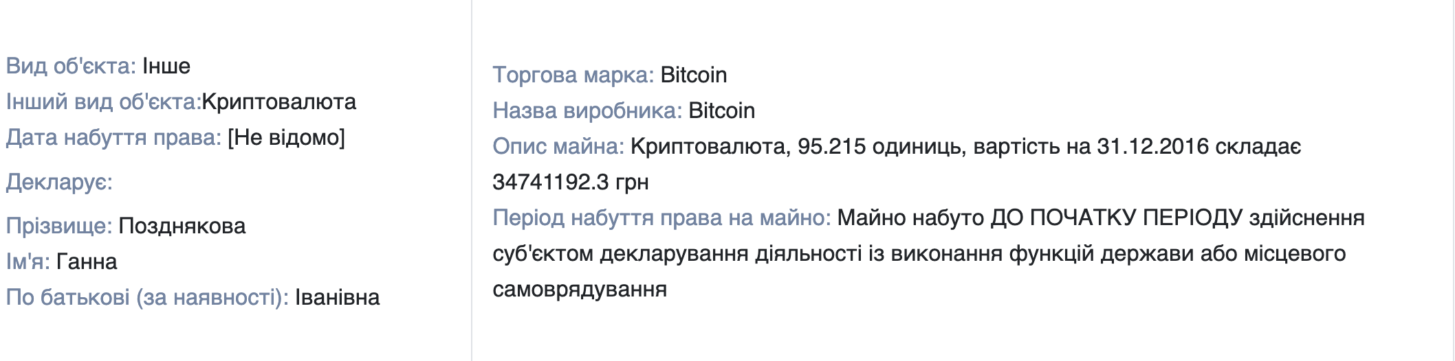 При этом Позднякова задекларировала приобретение криптовалюты на 95,215 Bitcoin, стоимость которой на конец 2016 года составлялась с 34,74 млн гривен.